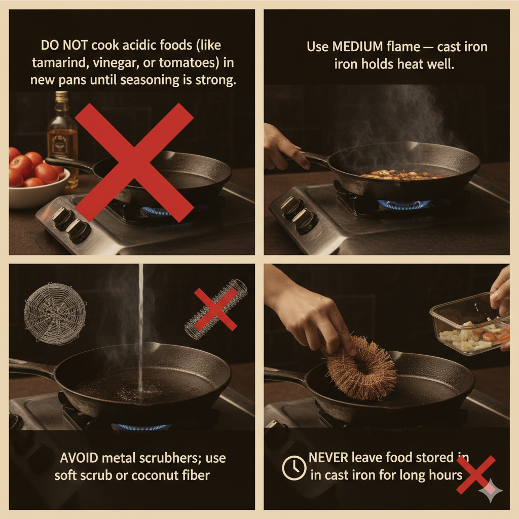 Do not cook acidic foods (like tamarind, vinegar, or tomatoes) in new pans until seasoning is strong.