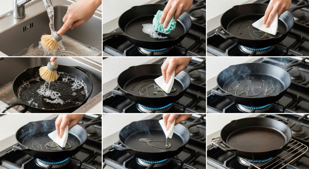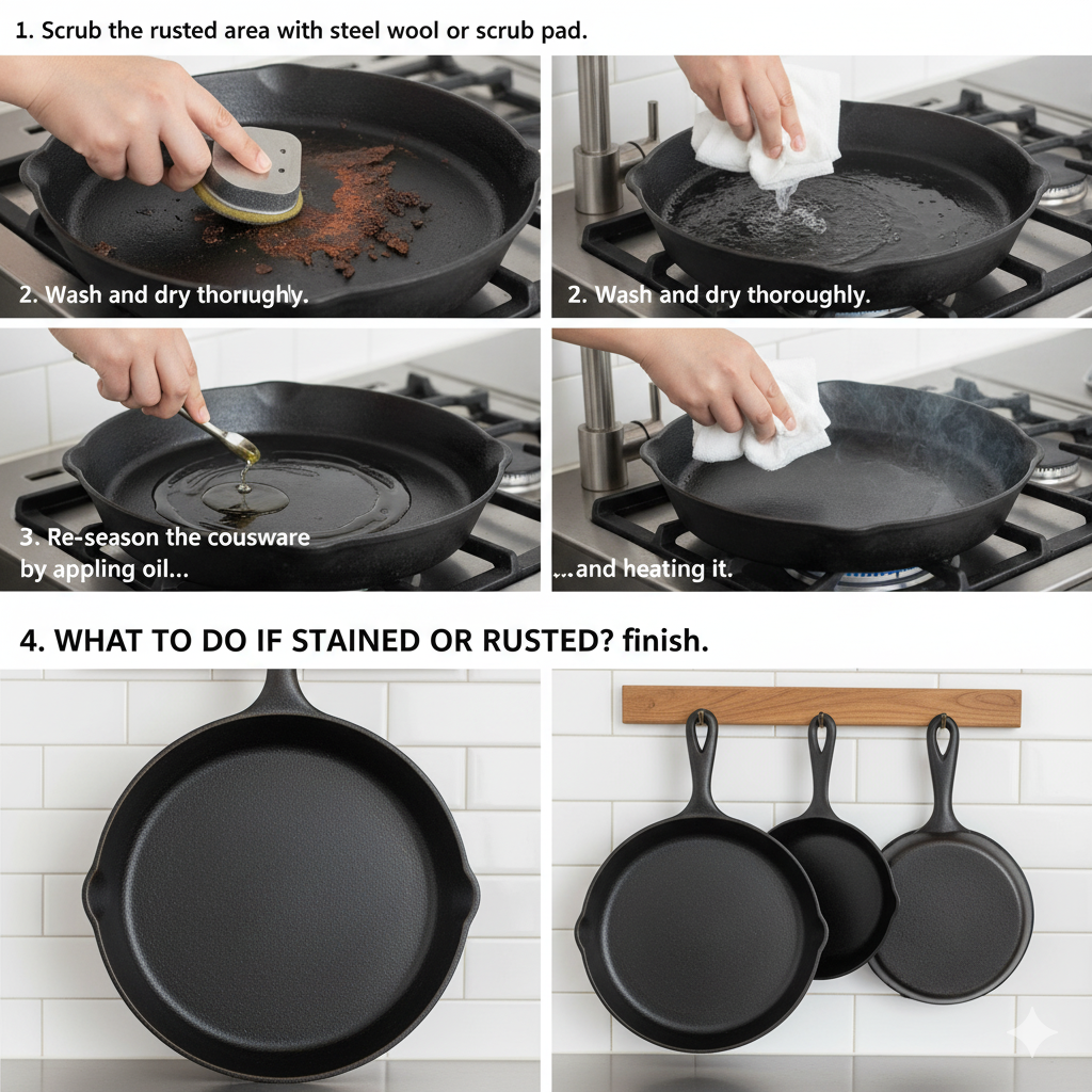 Re-season the cookware by applying oil and heating it.